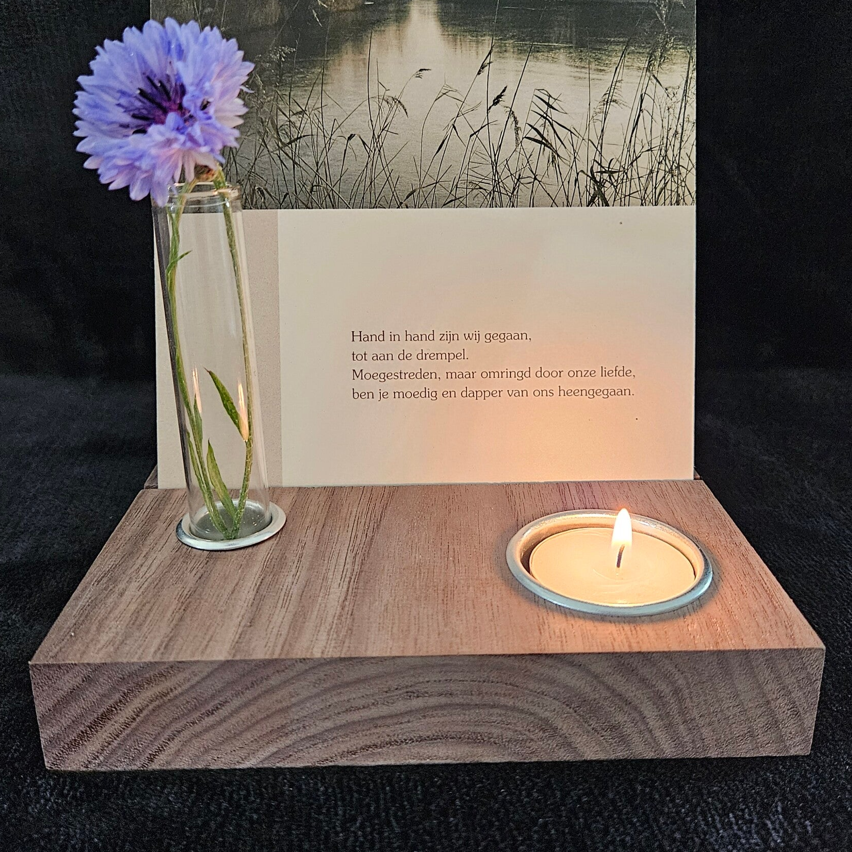 Gedenkplankje met waxinelichtje een glazen buisje € 14,50