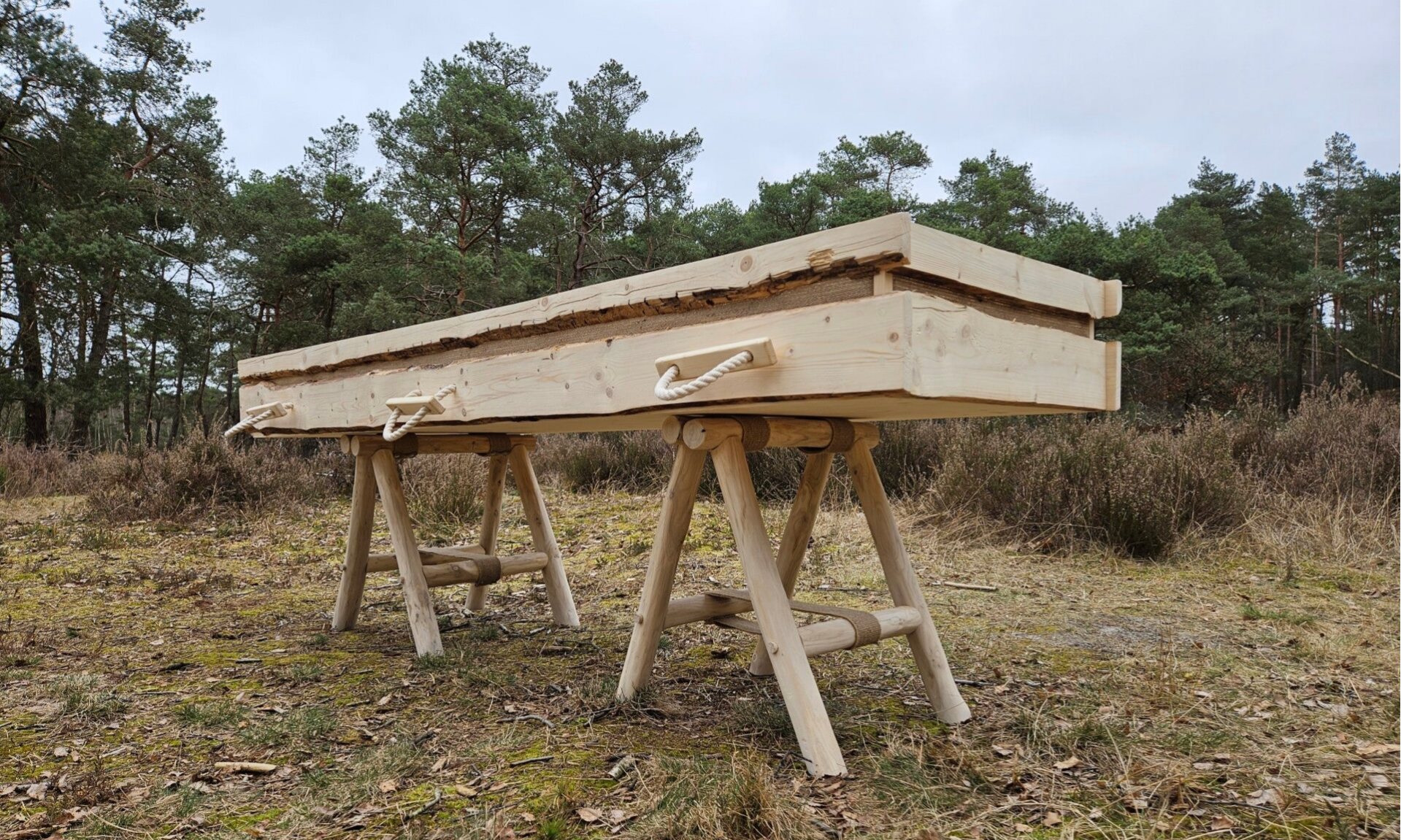 De baarkist is een uniek product door ons ontworpen. De baarkist is hoger dan een baarplank, maar wordt niet afgesloten met een deksel zoals bij een uitvaartkist. Hij wordt gebruikt in combinatie met een wade. www.rouwdoeken.nl